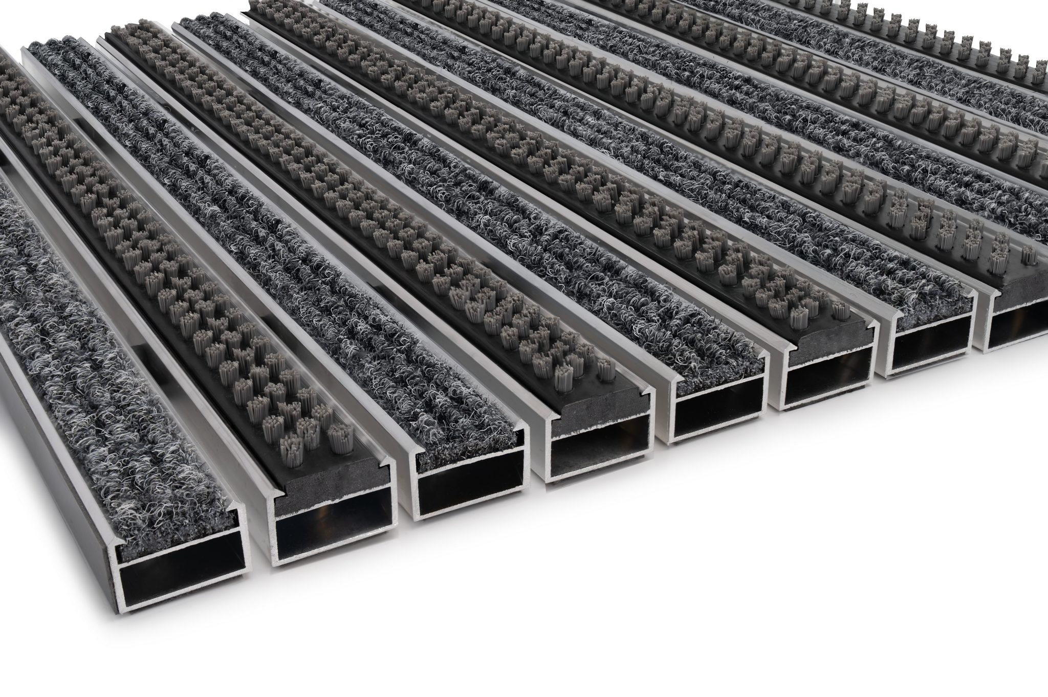 System mats with brush cleaning elements and drying inserts embedded in aluminium profiles. The combination of both these elements allows you to clean and dry your shoes from mud, snow and moisture. The drying inserts are resistant to abrasion, kneading and they absorb moisture well.