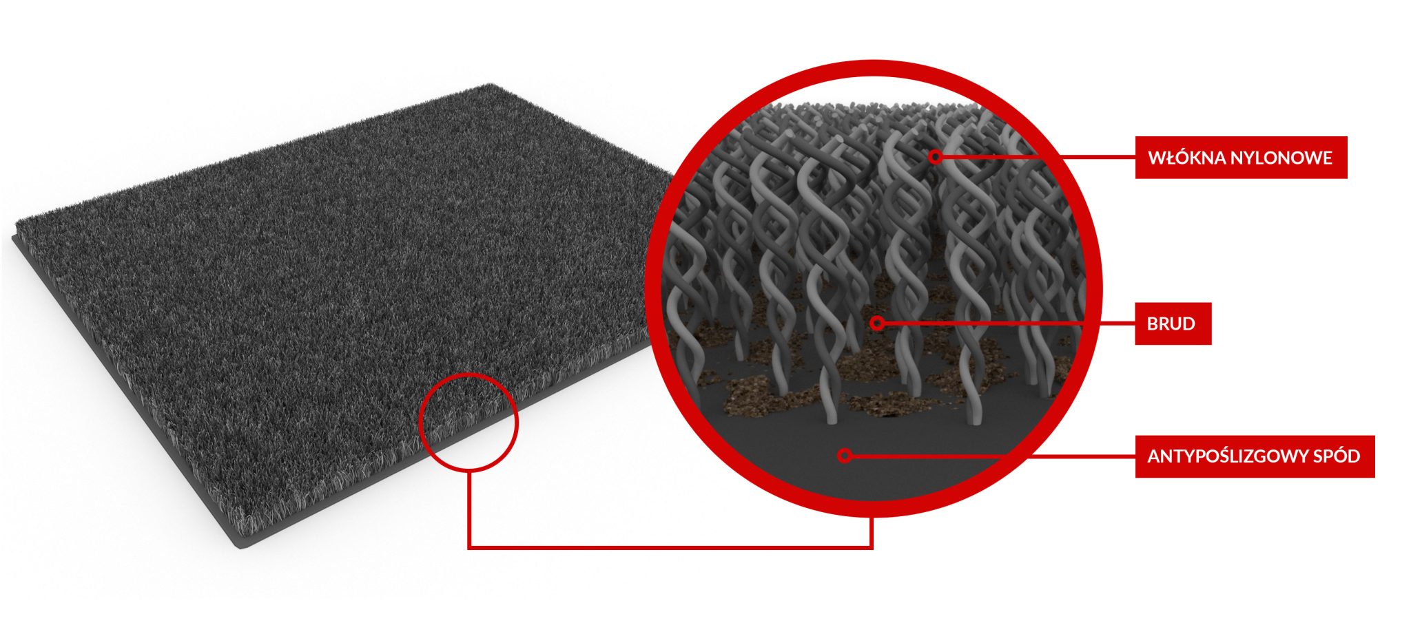 Made of nylon 6-6, through-dyed, with antistatic agents. Hair twist type: opi-twist, thermally secured. Stiff monofilaments remove large particles of dust from the shoes of people coming in, while soft fibres absorb moisture and stop it within the mat. If cleaned properly, the mat keeps its original look for many years.