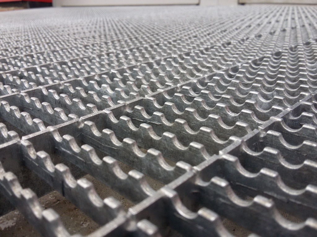 Hot-dip galvanized steel grids compliant with the norm DIN 50976. A construction flat bar and a twisted bar clean shoes and the wheels of shopping carts, and they have anti-slip properties. The open structure of grids enables storage of a great amount of sand and mud.